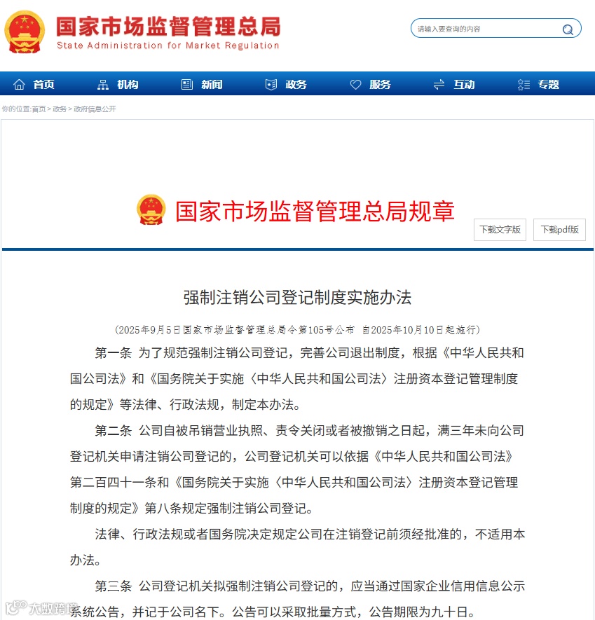 国家市场监督管理总局发布的《强制注销公司登记制度实施办法》自2025年10月10日起正式施行。