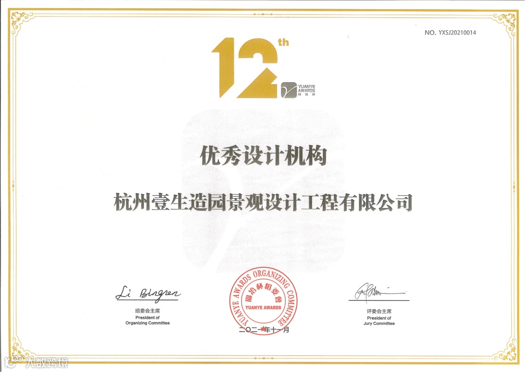 杭州壹生造园景观设计工程有限公司被评为——优秀设计机构