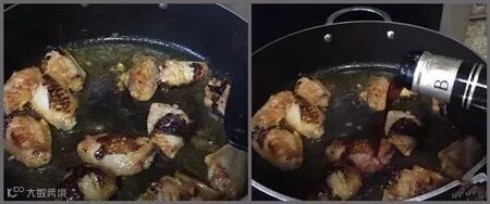 2.两面煎至金黄,加入盐、红酒、水调味