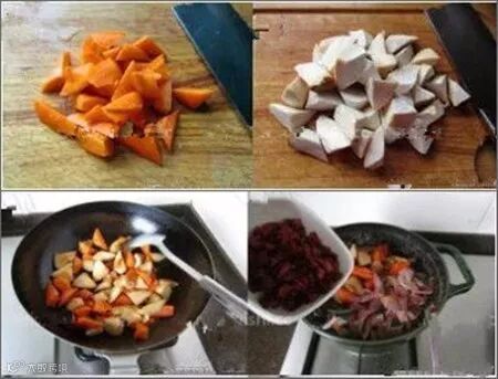 3.将胡萝卜、杏鲍菇切块,起锅化开黄油,将食材放入锅中炒至表面金黄后盛出,待牛肉慢炖2个小时后加入胡萝卜和杏鲍菇,再炖30分钟。