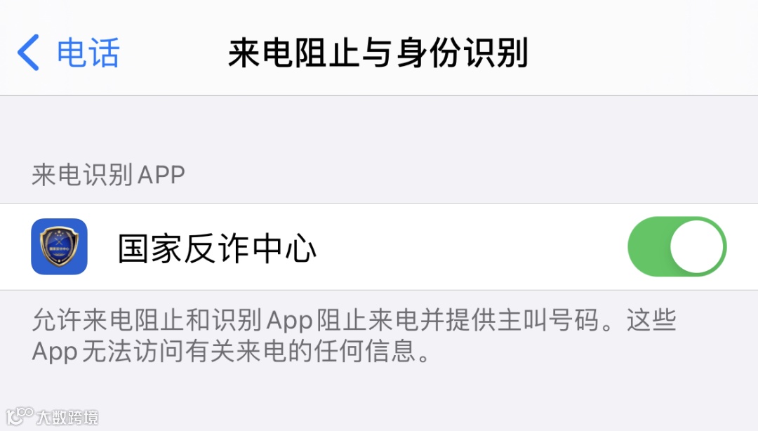 △ios系统用户需要在设置→电话→来电阻止与身份识别中,开启国家反诈中心的权限