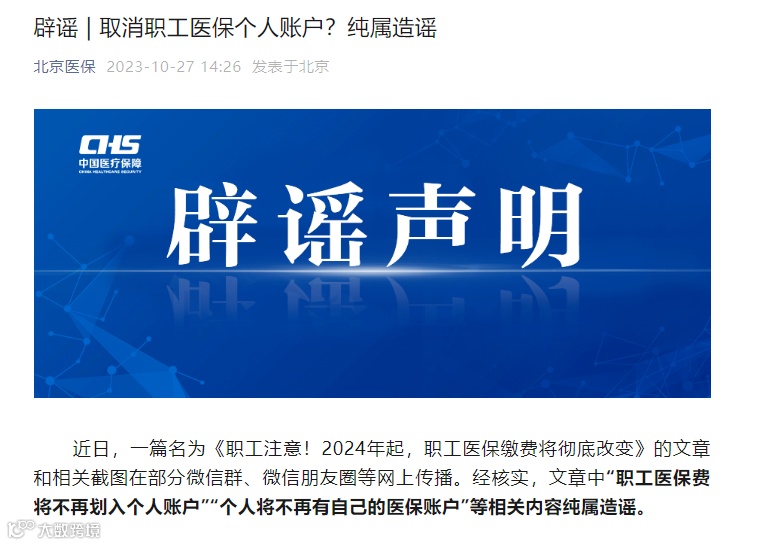 近日,一篇名为《职工注意!2024年起,职工医保缴费将彻底改变》的文章和相关截图在部分微信群、微信朋友圈等网上传播。经核实,文章中“职工医保费将不再划入个人账户”“个人将不再有自己的医保账户”等相关内容纯属造谣。
