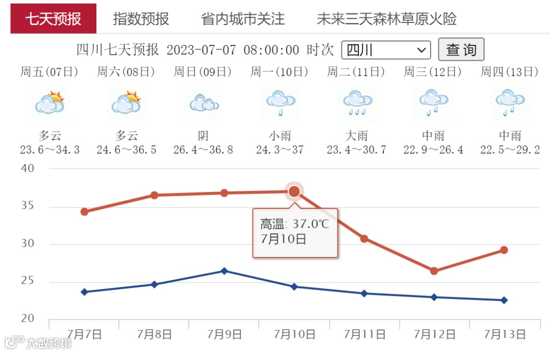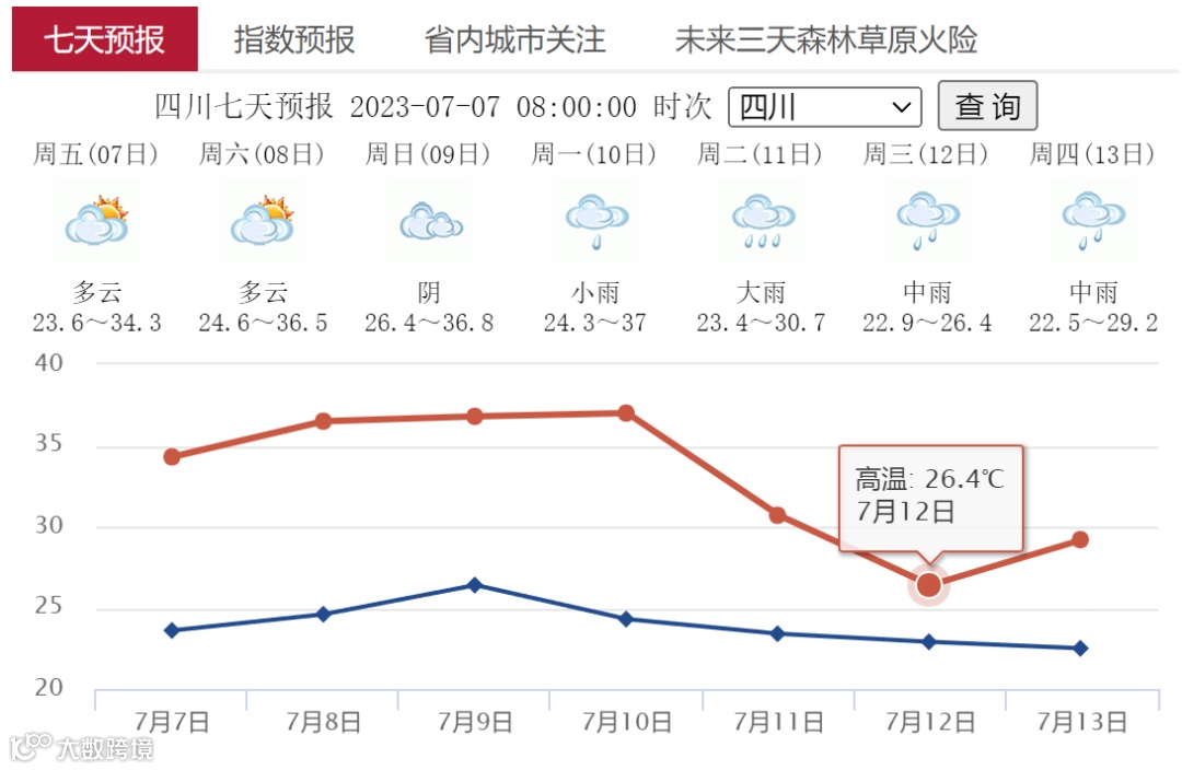 11日,全国最大落雨区将集中在盆地,持续多日的高温将因降雨“熄火”。据四川公共气象服务网预报显示,下周三,最高气温将狂降10℃左右,从7月10日的37℃下降至7月12日的26.4℃。