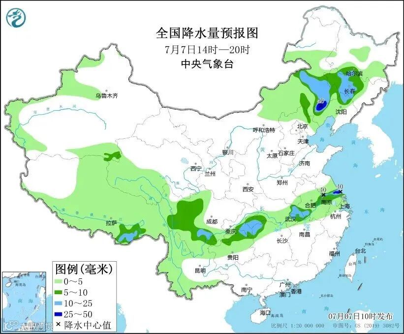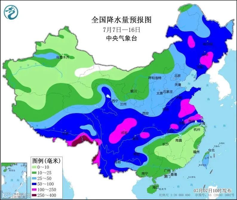 未来10天(7月7-16日),四川盆地、黄淮东部和南部、江汉、江淮、长江中下游沿江等地多降水,部分地区有100~150毫米,局地超过200毫米;四川盆地降水持续偏多,较强降水将出现在7-8日和11-14日。