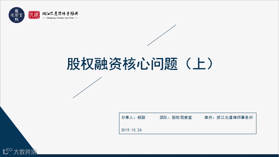 何为股权融资?股权融资的本质是什么?股权融资的流程及法律风险又有哪些?带着这三个关键性问题,江小虹带你走进新一期【江虹军师联盟】的课程,我们的老朋友浙江允道律师事务所创始合伙人杨甜律师将为大家答疑解惑,掌握股权融资核心问题中的奥秘。
