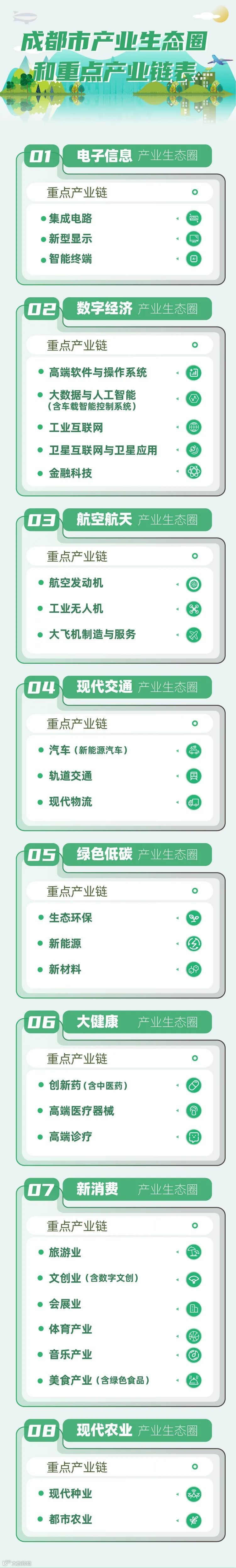 成都优化调整生态圈和产业链体系,布局电子信息、数字经济、航空航天、现代交通、绿色低碳、大健康、新消费、现代农业等8个产业生态圈,主攻28条重点产业链。一个产业生态圈囊括了几条重点产业链,少则包含2条重点产业链,多则包括6条重点产业链。以新消费产业生态圈为例,其涵盖的重点产业链数量最多,包括旅游业、文创业(含数字文创)、会展业、体育产业、音乐产业、美食产业(含绿色食品)等。