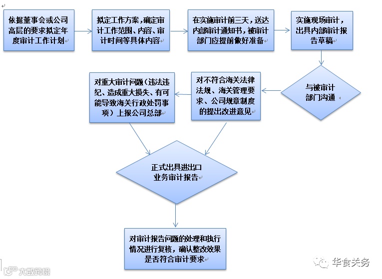 2、审计实施阶段:根据审计方案对被审计单位的内部控制情况以及对进出口业务活动的合规性进行测试和复核,这个合规性包括符合相关法律法规、海关法律法规、海关管理要求、行业要求和公司规章制度。
