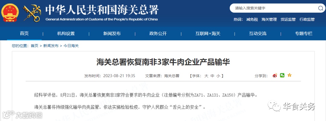 2023年8月21日,海关总署发布公告,经科学评估,8月21日,海关总署恢复南非3家符合要求的牛肉企业(注册编号分别为ZA71、ZA131、ZA150)产品输华。