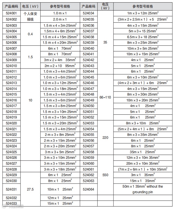 覆盖 0.4kV 至 550kV 多电压等级,规格丰富(如 1mx3+12m 25mm² 等),满足多样化需求。