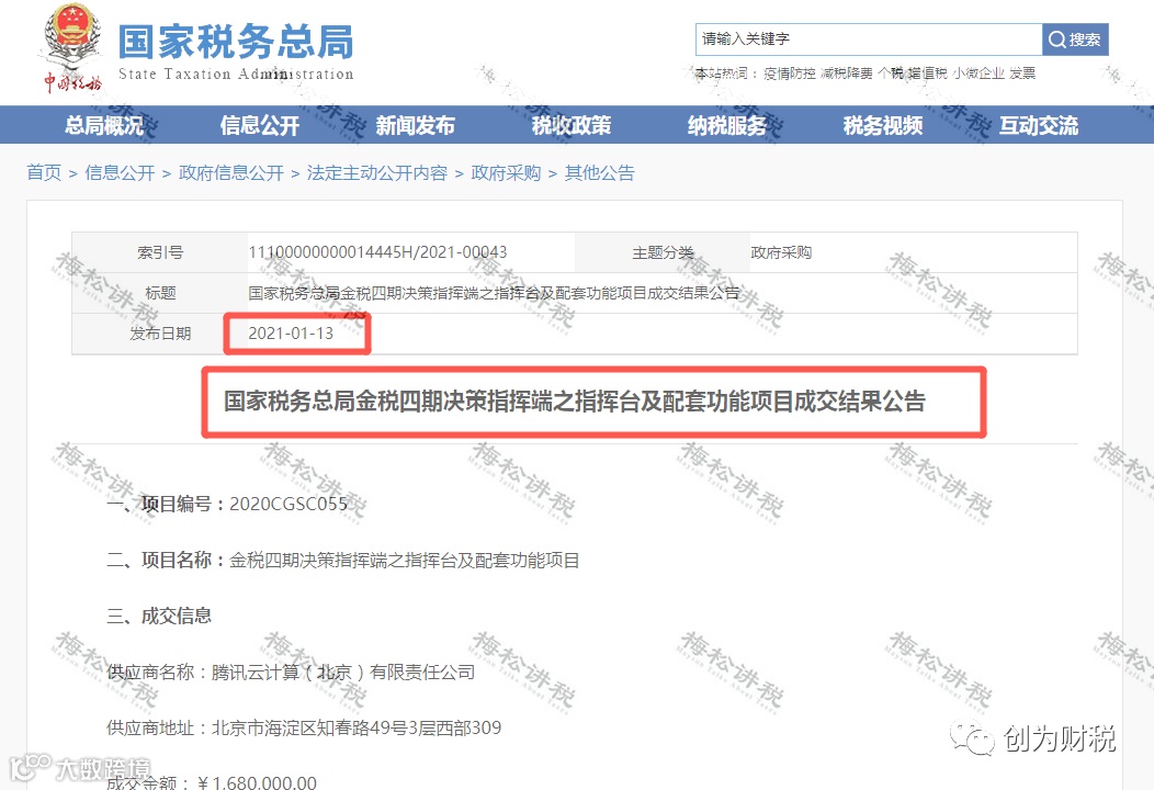 1月13日,国家税务总局发布金税四期决策指挥端之指挥台及配套功能项目成交结果公告: