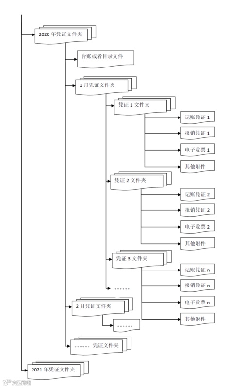 无电子档案管理系统的单位,如实施了会计信息系统,与电子发票相关的记账凭证、报销凭证等已全部实现电子化,可将电子发票与相关的记账凭证、报销凭证等移交会计档案管理人员保存,编制档号,存储结构建议采取下图所示方式: