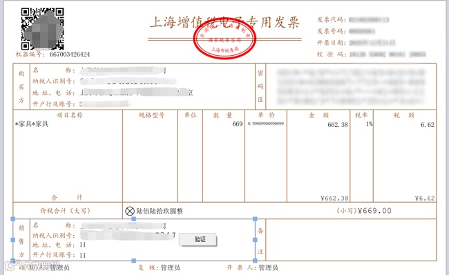验证电子发票监制章具体方法如下:通过增值税电子发票版式文件阅读器打开已下载的电子专票版式文件,鼠标右键点击发票上方椭圆形的发票监制章,选择“验证”,即可显示验证结果。