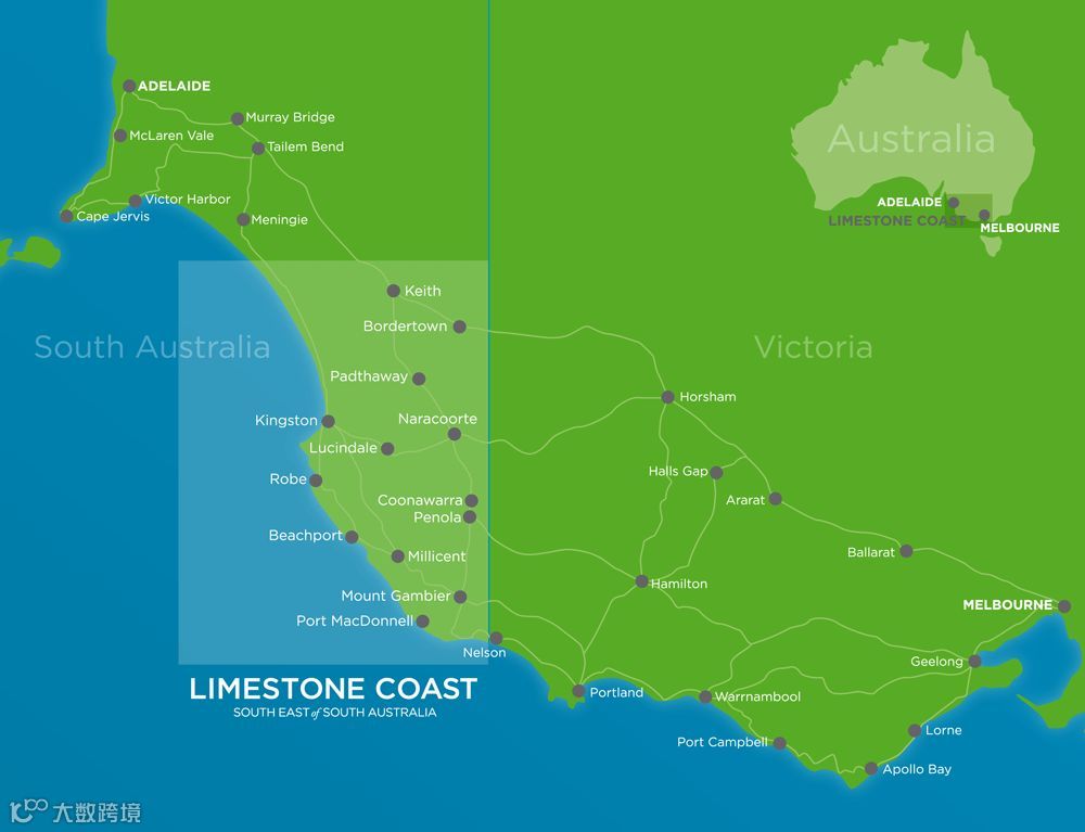 南澳大利亚石灰岩海岸GI(地理标志)位于该州的东南角,东部与维多利亚州接壤。它是澳大利亚最重要的葡萄酒产区之一,出产近三分之一的南澳大利亚优质葡萄酒,其中一些是澳大利亚最受好评的葡萄酒。石灰岩海岸在1996年获得GI地位。