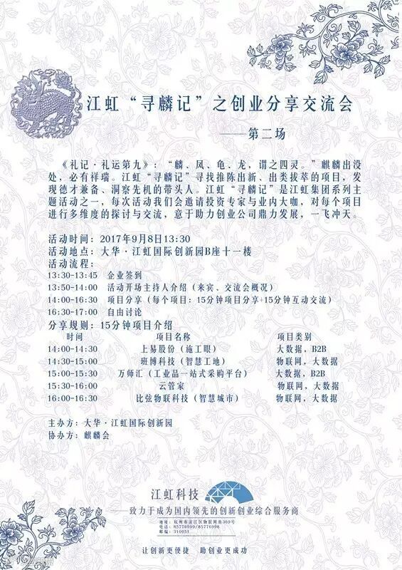 ▲ 江虹“寻麟记”是江虹集团系列主题活动之一,每次活动我们会邀请投资专家与业内大咖,对每个项目进行多维度的探讨与交流,意于助力创业公司鼎力发展,一飞冲天。