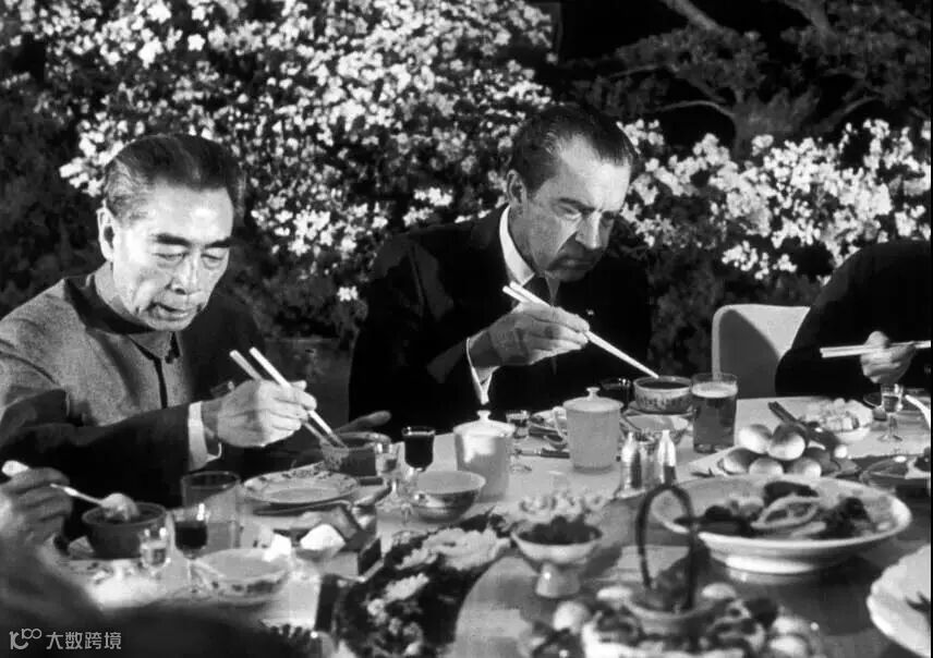 1972年,北京人民大会堂,美国总统尼克松和中国总理周恩来在晚宴上。知道到中国后免不了要用筷子,为了不出洋相,他提前半年就学习使用筷子。
