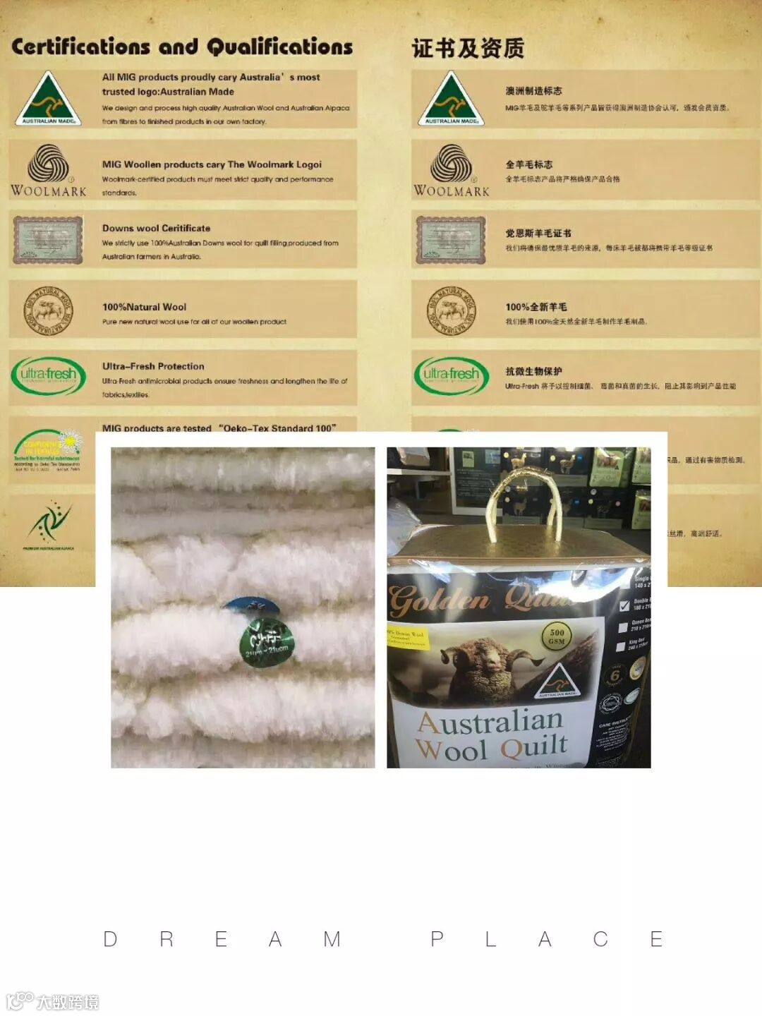MIG是澳洲最早使用downs wool做羊毛被的工厂,所有被子带第三方鉴定证书,所使用并处理当地羊毛纯净无杂质,无任何异味,蓬松均匀度都清晰可见。温暖的阳光来自澳洲,守护您整个冬季!