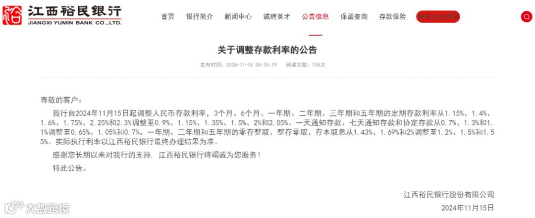 其中,江西裕民银行年内调整存款利率最为频繁,本次已是该行年内第五次公告下调存款利率。此前在今年2月、7月、8月和10月,江西裕民银行也均公告下调存款利率。