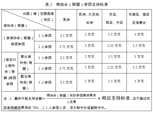 1家商协会(联盟)组团参团,按地区划分给予最高1人参团2.5万元、2人参团3.75万元标准定额支持。2家及以上商协会(联盟)组团参团,由商协会(联盟)自行确定一家牵头商协会(联盟),其余为配合商协会(联盟),对牵头商协会(联盟),按地区划分给予最高1人参团2.5万元、2人参团3.75万元标准定额支持;对配合商协会(联盟),按地区划分给予最高2.5万元标准定额支持,最多补贴1人。