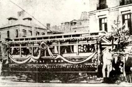 1908年3月5日,上海第一辆有轨电车身披盛装行驶至广东路外滩