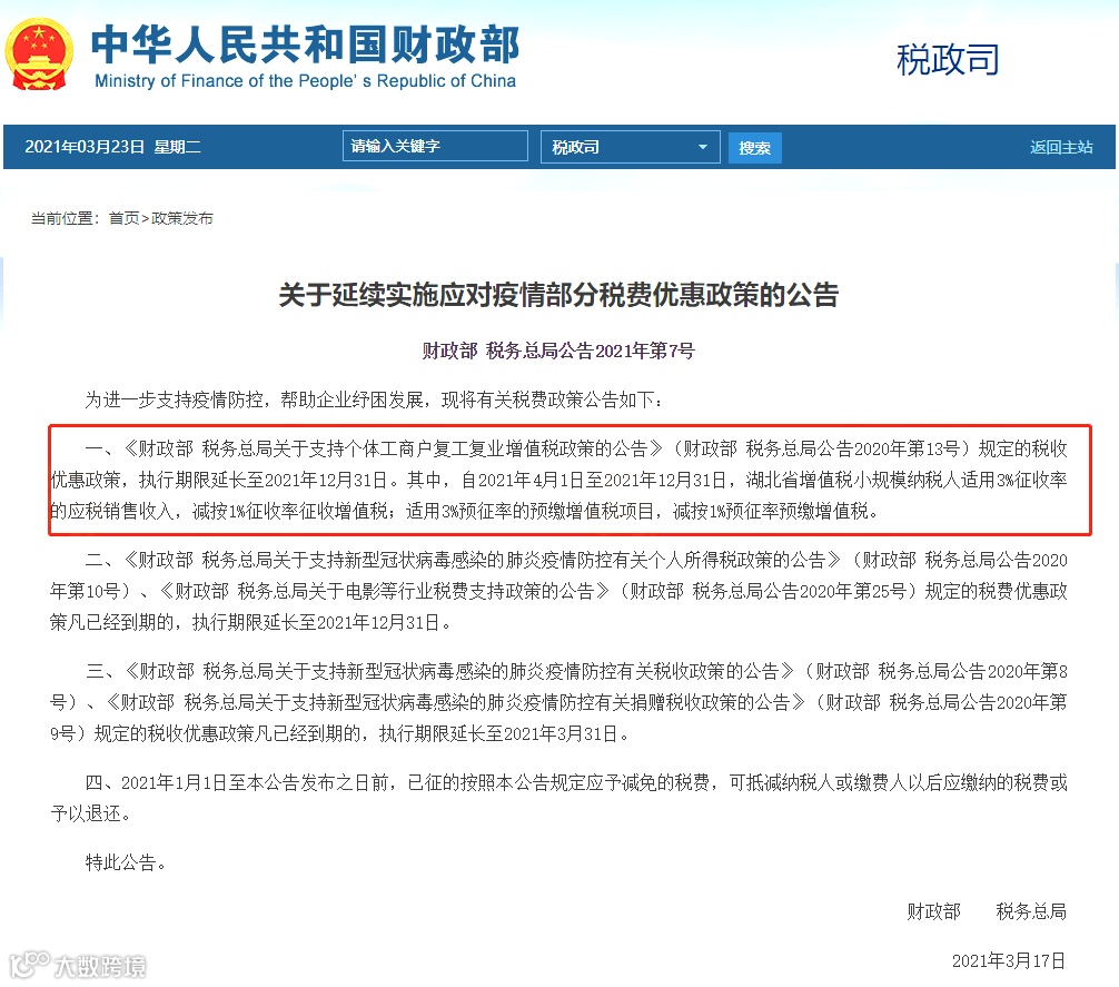 2021年3月23日 财政部 税务总局关于延续实施应对疫情部分税费优惠政策的公告(财政部税务总局公告2021年第7号 ):