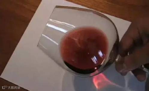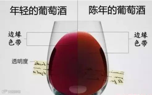 通常一款陈年低于三年的红葡萄酒中心部位会呈现浓郁的紫色,然后顺着边缘部分递减。如果再过个五年、十年,这款葡萄酒的中心颜色会过渡至深红色,然后会慢慢演变成红褐色。有些非常成熟的红葡萄酒的中心部位甚至会呈现深灰色,其边缘色带则为黄褐色。