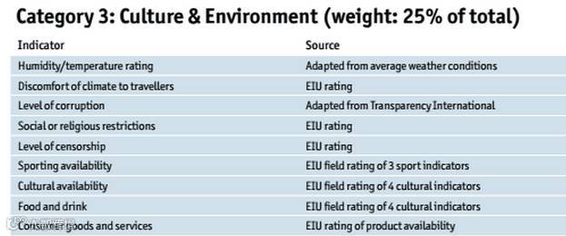打分是根据该城市的医疗保障,教育水平,稳定,文化氛围,城市环境以及公共设施等级而评定,共有世界上最受瞩目的140个城市被评分。