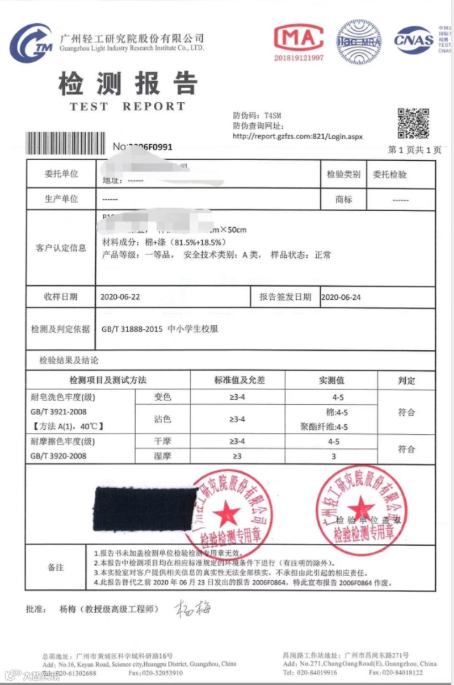采用ATC系列染料大货国内一等品第三方检测报告,色牢度OK▲