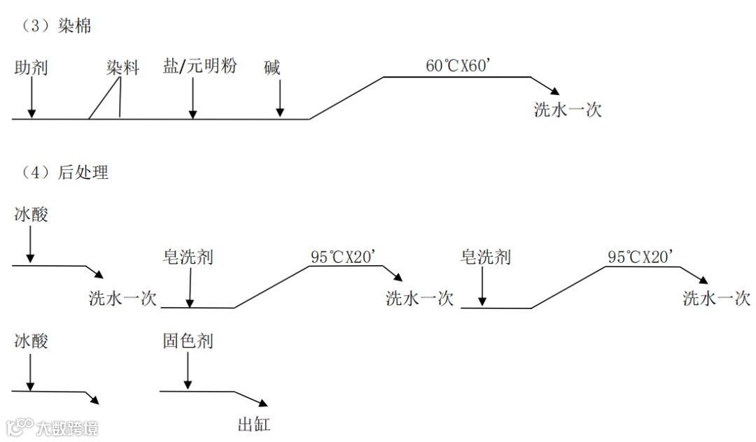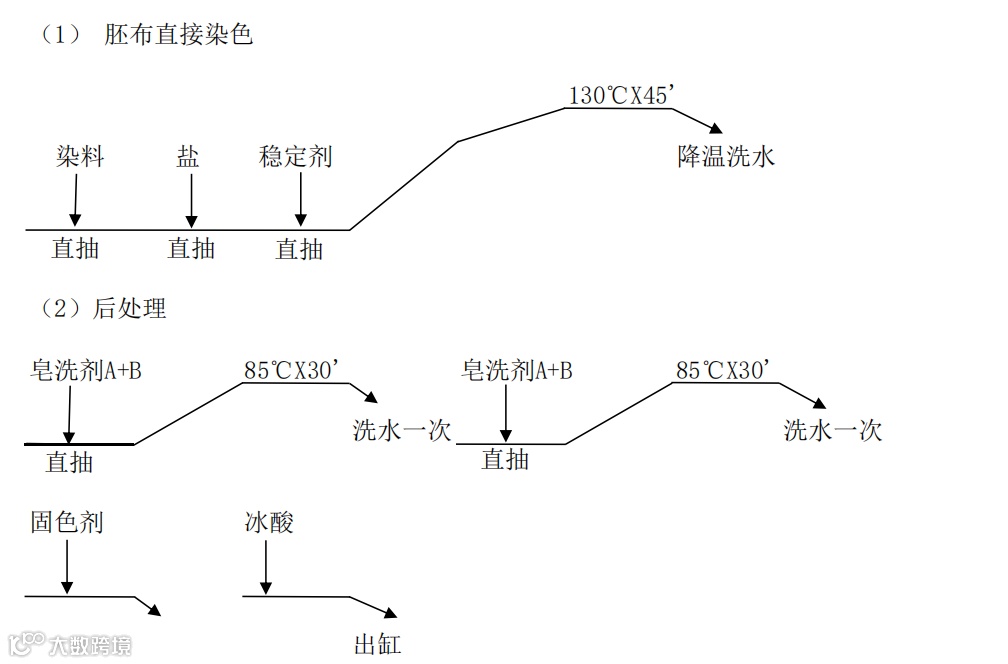 T/C黑色传统工艺,一般有这几个工艺环节:前处理→染涤→还原清洗→染棉→后处理。