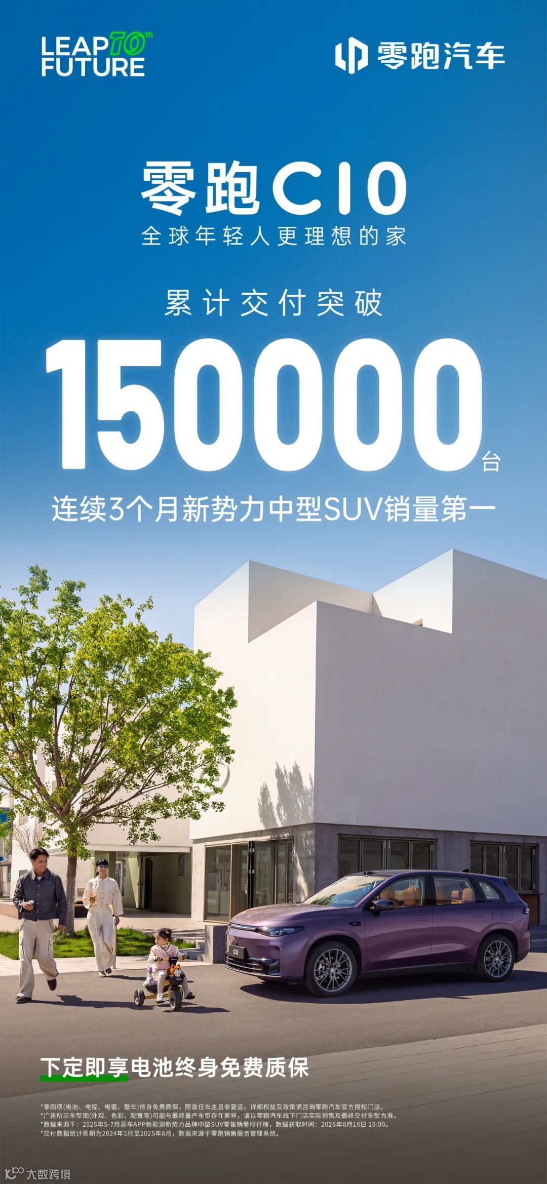 2025年8月18日,零跑汽车旗下全球战略车型零跑C10迎来里程碑时刻——上市仅16个月,累计交付量突破15万台,刷新零跑品牌在售车型达成此规模的最快纪录。依托越级产品力,零跑C10持续引爆市场,2025年5月至7月,已连续3个月蝉联新势力中型SUV销冠,并稳居2025年上半年新势力中型SUV销量榜首。此外,根据中国汽车流通协会和精真估联合发布的《2025上半年中国汽车保值率研究报告》,零跑C10更以纯电动中型SUV一年保值率第二的成绩,成为年轻家庭用户心中兼具价值与品质的理想之选。