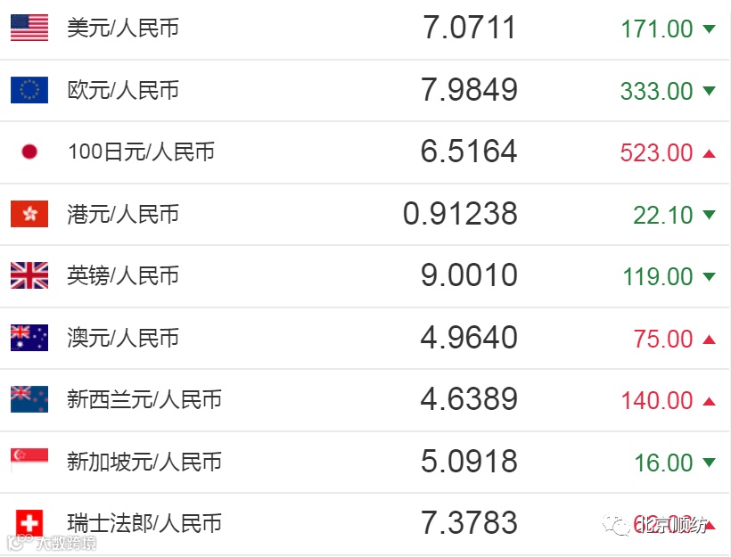 中国人民银行授权中国外汇交易中心公布,2020年6月9日银行间外汇市场人民币汇率中间价为:1美元对人民币7.0711元,1欧元对人民币7.9849元,100日元对人民币6.5164元,1港元对人民币0.91238元,1英镑对人民币9.0010元,1澳大利亚元对人民币4.9640元,1新西兰元对人民币4.6389元,1新加坡元对人民币5.0918元,1瑞士法郎对人民币7.3783元,1加拿大元对人民币5.2836元。