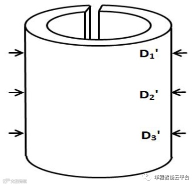 如下图所示,测量3点钟位置长度方向三处的外圆直径D1′、D2′、D3′,计算应力释放后试样的平均外径D ′。