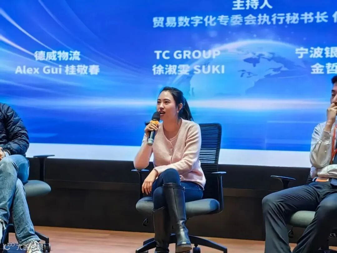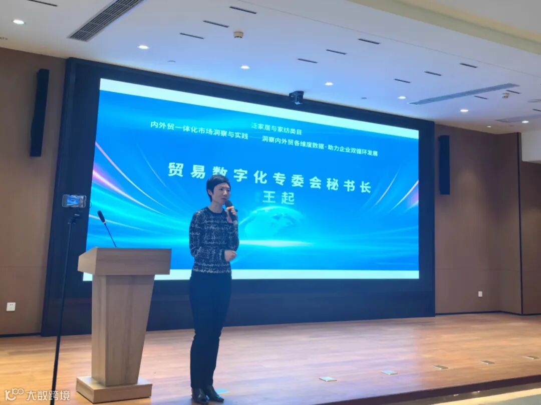 接下来,专委会秘书长王起发表讲话,她介绍道:“贸易数字化专委会是在浙江省商务厅和滨江区政府共同的支持下于2021年成立的,是浙江省国际数字贸易协会下设分会。贸易数字化是以数据驱动为核心,以平台作为支撑,贸、产、服有机融合的数字化、智能化、网络化构建的一个贸易全产业链数字化生态服务体系,力求实现内外贸一体化、数字化供应链和智能制造三大目标。专委会致力于推动内外贸一体化发展并做了许多探索与实践。