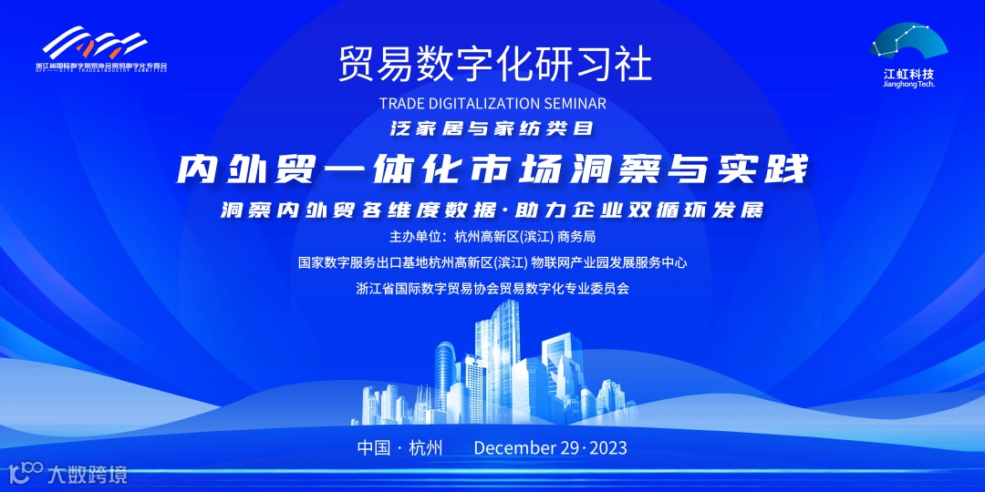 2023年12月29日下午,泛家居家纺行业“内外贸一体市场洞察与实践”贸易数字化研习会在滨江区物联网产业孵化器二楼多功能会议室盛大举行。本次活动由滨江区商务局、国家数字服务出口基地杭州高新区(滨江) 物联网产业园发展服务中心、浙江省国际数字贸易协会贸易数字化专业委员会(以下简称专委会)主办,杭州江虹科技有限公司承办,江虹园区侵尘文化、迪欧达、盛萃等多家园区企业共同参与本次研习活动。