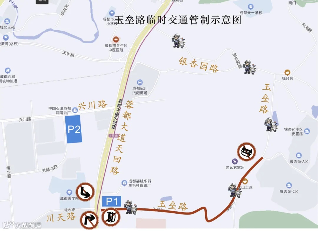 (二)玉垒路(蓉都大道天回路至翠微路段)禁止机动车通行(区间车、公交车、警车、消防车、救护车、工程救险车、专项作业车除外)。