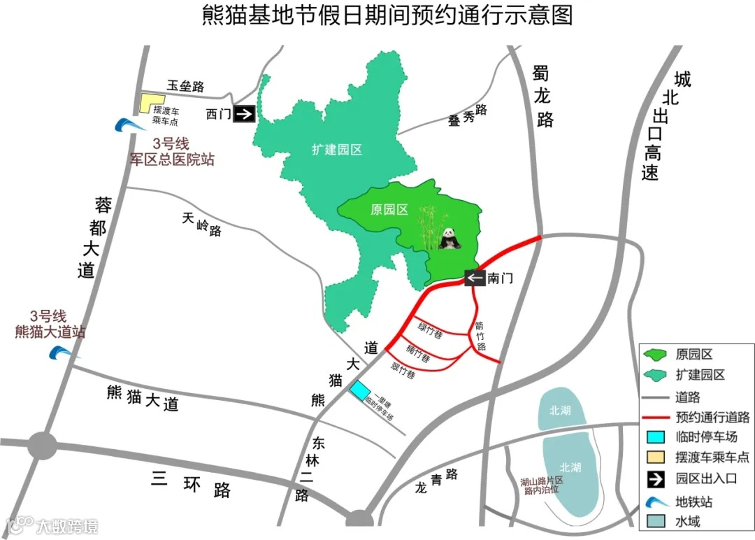 (一)熊猫基地西门(扩建区)未配建自驾车停车场,为公共交通出行游客的主要出入口。游客乘坐地铁3号线至军区总医院(熊猫基地)站,换乘专用摆渡车(车程约3分钟)可直达景区。