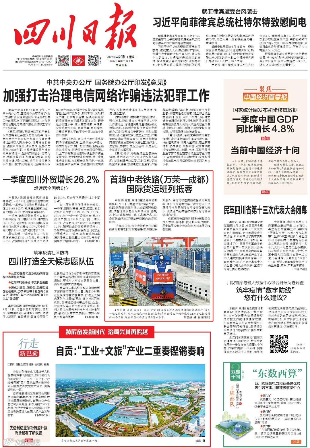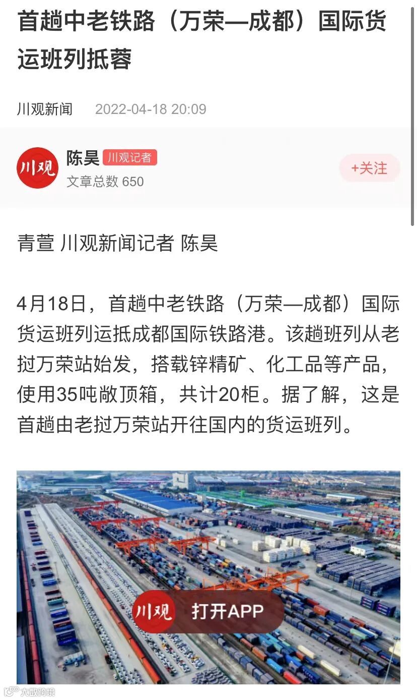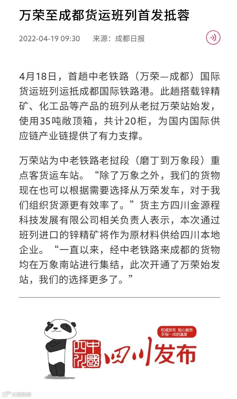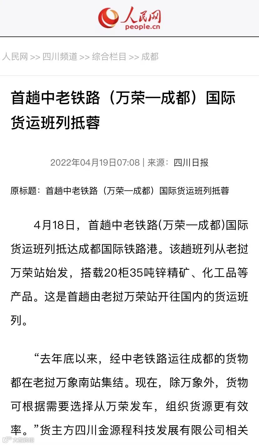 4月18日,首趟中老铁路(万荣—成都)国际货运班列抵达成都国际铁路港。该趟班列从老挝万荣站始发,搭载20柜35吨锌精矿、化工品等产品。这是首趟由老挝万荣站开往国内的货运班列。