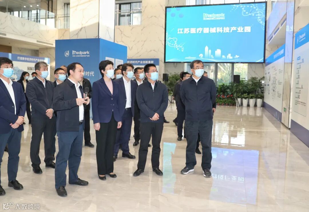 ↑施小琳等市领导在江苏医疗器械科技产业园考察学习