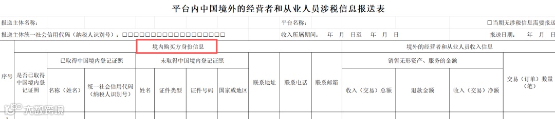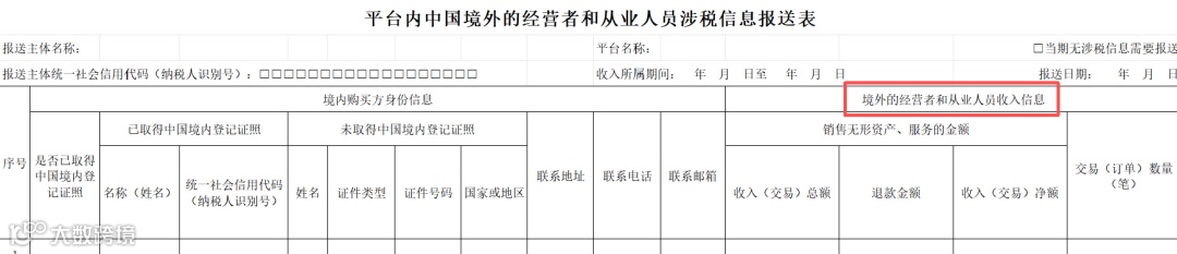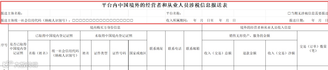 《平台内中国境内的经营者和从业人员涉税信息报送表》适用于境外互联网平台企业涉税信息的报送主体报送平台内中国境外的经营者和从业人员向中国境内销售服务、无形资产的涉税信息。