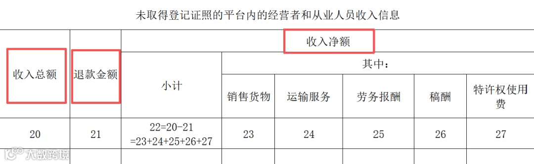 未取得登记证照的平台内经营者和从业人员收入信息主要填写“收入总额”、“退款金额”和“收入净额”。