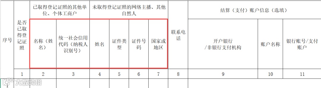 身份信息填报:应该区分已取得登记证照的和未取得登记证照的来填报。已取得登记证照的其他单位、个体工商户,填写名称和统一社会信用代码;未取得登记证照的网络主播、其他自然人,要填写姓名、证件类型、证件号码、国家或地区。“是否已取得登记证照”这一列无需填写。由系统自动识别。