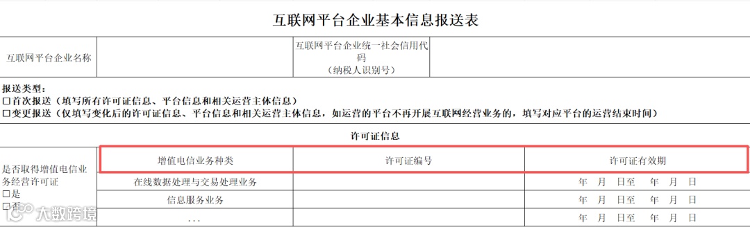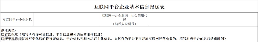 表头主要填写平台企业的名称及社会信用代码(纳税人识别号)。如果是首次报送则需要填写所有许可证信息、平台信息和相关运营主体信息;如果是变更报送,只需要填写变化后的许可证信息、平台信息和相关运营主体信息;若运营的平台不再开展互联网经营业务的,要填写对应平台的运营结束时间。