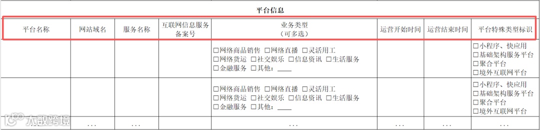 平台信息,主要填写“平台名称”、“网站域名”、“服务名称”、“业务类型”等。其中,业务类型要按照平台实际情况填写,比如网络商品销售、网络直播、灵活用工、网络货运等,可以填写多个类型。