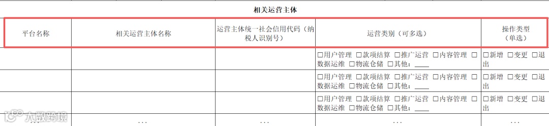 相关运营主体,主要填写参与互联网平台运营的各类市场主体(报送主体除外)。