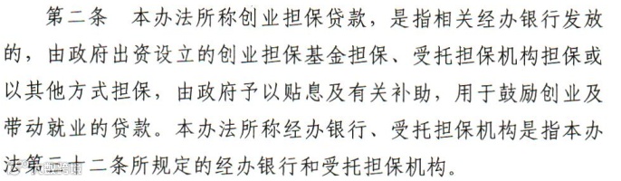 “创业担保贷款分为两类:第一类是向“重点人群”发放的由创业担保基金或受托担保机构提供担保并免除反担保要求的贷款;第二类是指以抵押、质押、保证等其他方式提供担保的贷款......”(重点人群:在校大学生、毕业5年以内高校毕业生、就业困难人员、市区户籍的登记失业人员和转业复退军人)