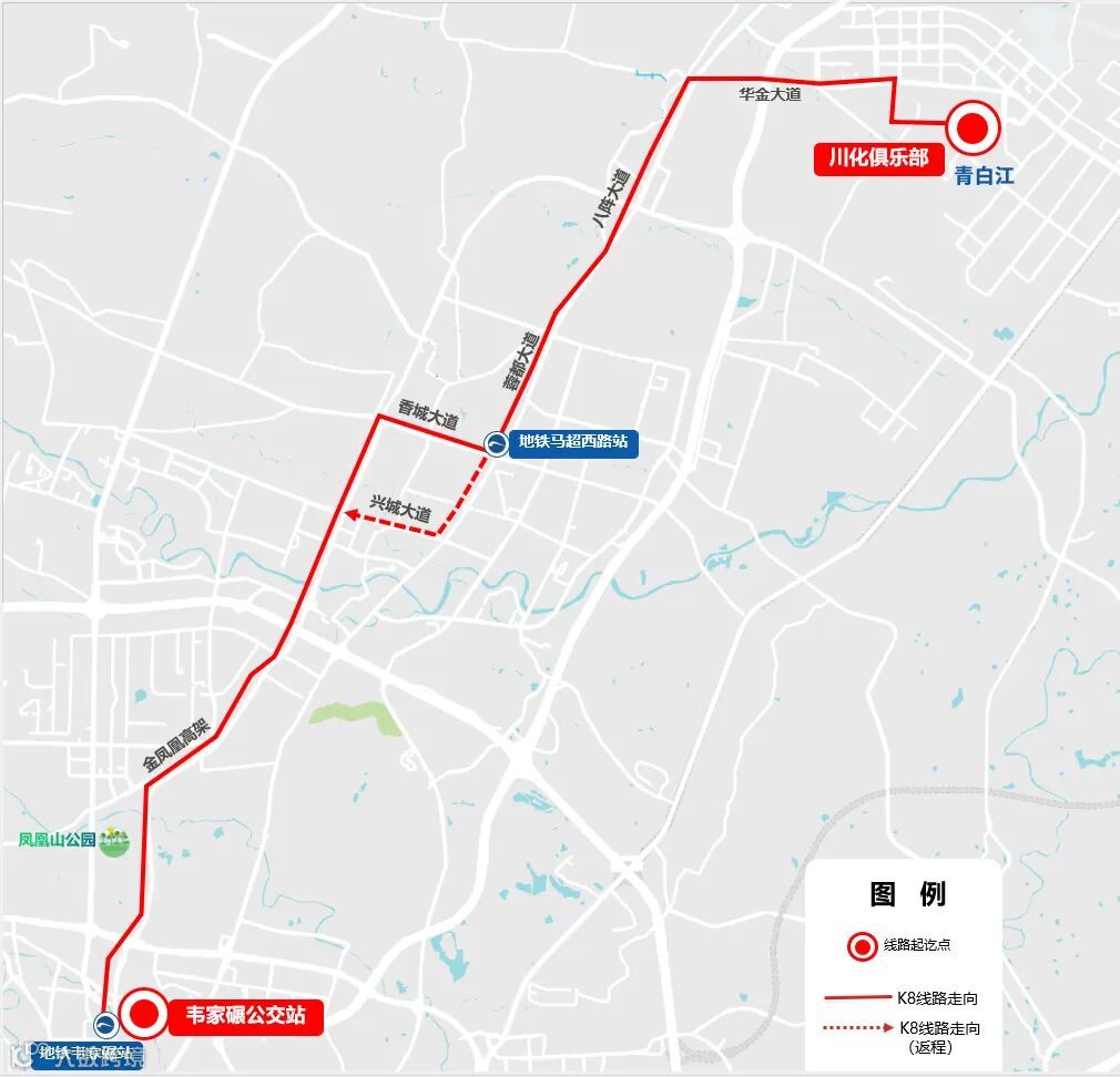 返程:川化俱乐部经华金大道、八阵大道、蓉都大道、兴城大道、金凤凰高架到韦家碾公交站