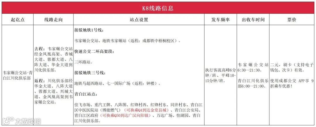 出收车时间:韦家碾公交站6:30--21:30、青白江川化俱乐部6:00--21:00。
