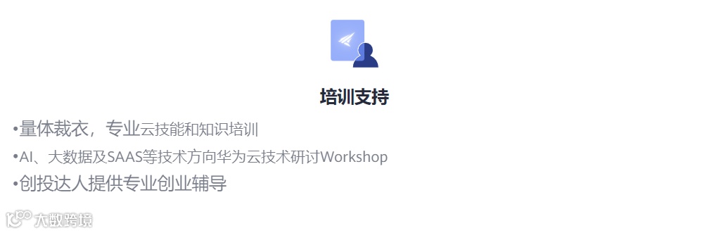 为初创企业提供专家资源、技术研讨等培训支持;包括云计算、人工智能、大数据等方向的技术支持;商业代金券、与VC机构快速对接等商业营销支持,帮助初创企业加速成长。
