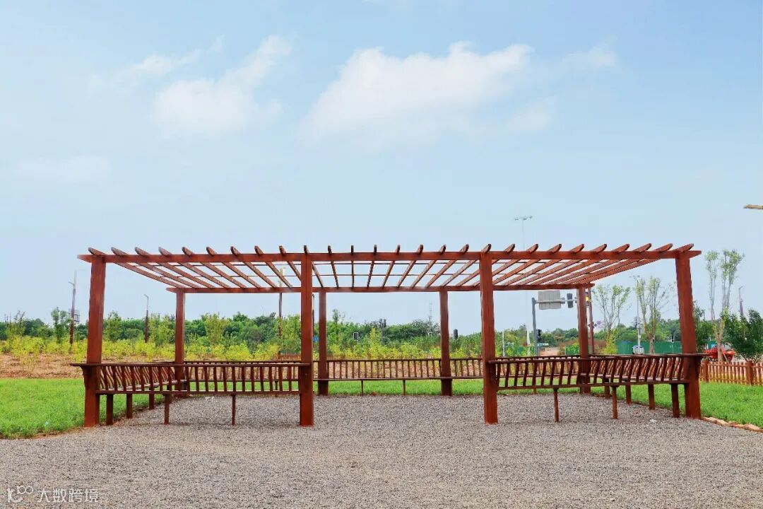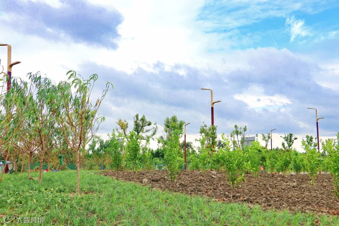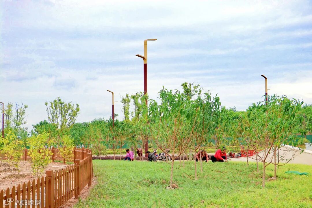 除去花果外,共享果园还配备滨河步道以及文化景观,利用原有的地形地貌结合周边水系、街区和植被等地形,使果园与周边空间相互融合渗透,形成果苗观光景观。同时在路口结合产业城文化进行展示,也起到一定的导视作用。