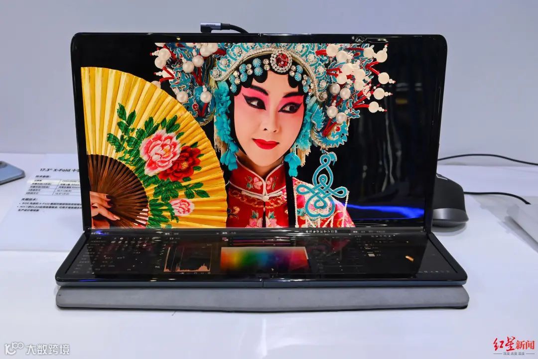 “屏幕不但可以左右折,还可以上下折。”在京东方技术人员的展示下,折叠屏在他的手中灵活地变换两种形态尺寸,“我们在常规笔记本的对折基础形态上兼容了另一方向,让折叠屏可以拥有更大的显示面积。例如,在16:9的折叠形态下,垂直的屏幕可以用于视频或图像显示,而贴近桌面的部分就可以用于触控,进行视频剪辑或者图像编辑的操作。”