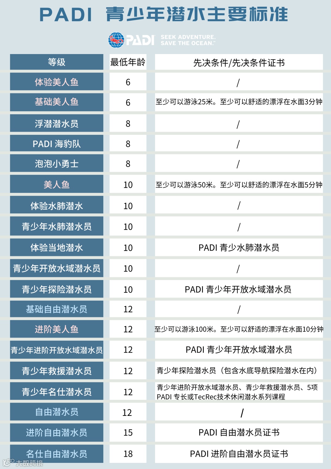 10-14岁为“青少年”级别,需由认证成人(父母/教练)陪同潜水;